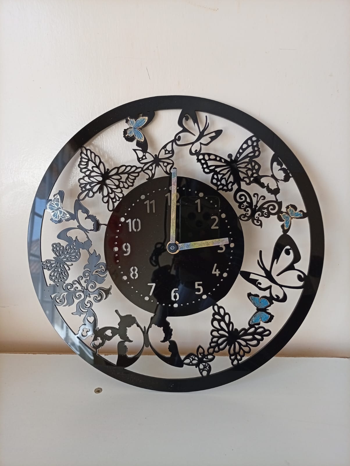 The elegant circular frame features intricate butterfly silhouettes accented with subtle colour highlights, creating a striking focal point for living rooms, bedrooms, offices, or gift occasions. Its clear numeric display ensures easy time reading while maintaining a sleek decorative appearance.